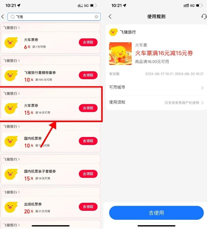 支付宝领飞猪16减15元火车券