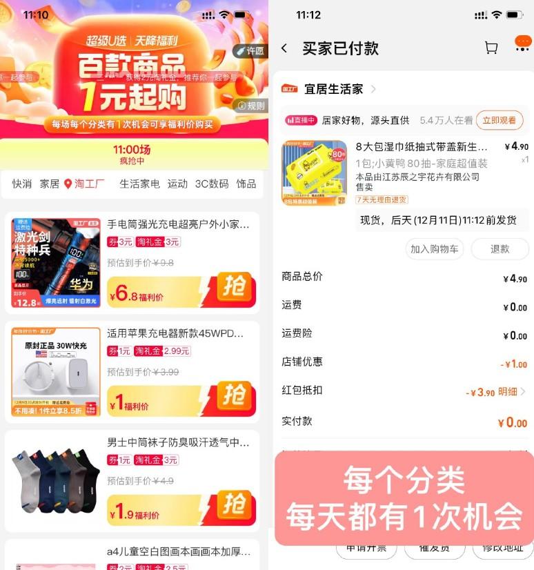淘宝天降福利1元撸实物包邮