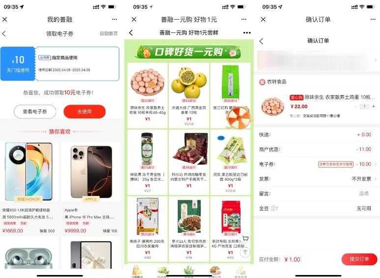 建行善融领10元券1元购实物
