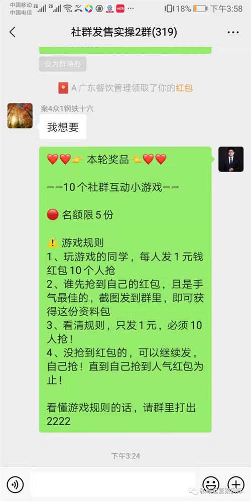 很多时候,我们在群里发了很多红包,有人抢,却没有人回应,这样发的红包就没什么意义。那么接下来教大家一种社群互动小游戏红包互动的玩法,不管是再怎么样不活跃的群,用完大家都会抢着发红包。经过测试,如果奖品足够诱惑力,会吸引大量的人在群里发红包,非常的火爆。