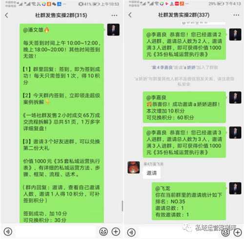 要学会控场,通过话术引导,先让群内一部分人邀请起来,后面就会有很多人参与,你的邀请礼品,要有高诱惑、高价值、低成本、客户想要的、能够解决客户某个问题的,那么你的社群就可以轻松裂变起来了。比如我送的一份《35套私域运营执行表》,每天都有很多人自发邀请好友。