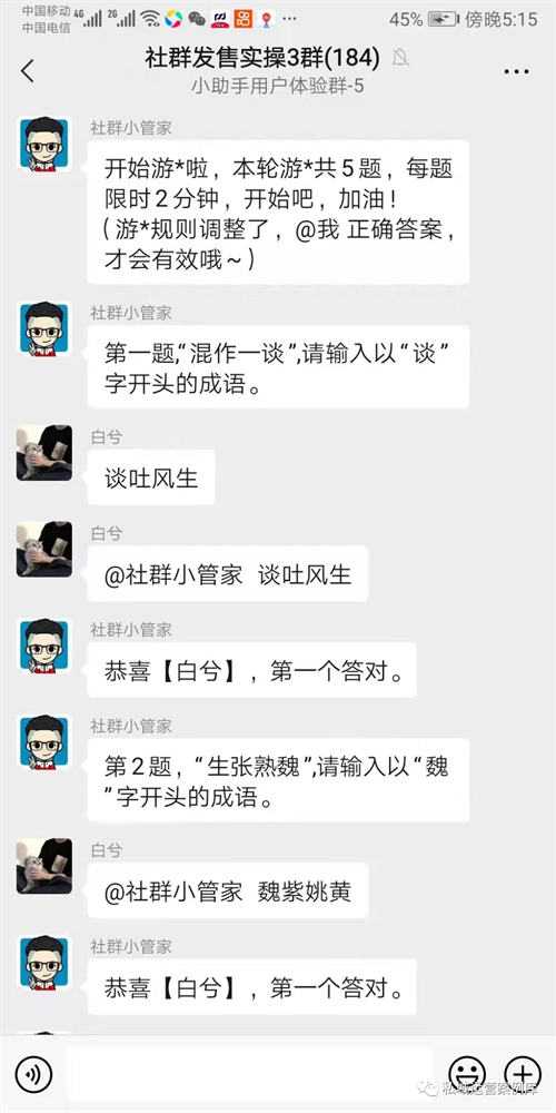 题目不要太难,否则很多人答不出来,就不能产生互动效果,可以群内抛出3~5个抢答题目,让群活跃起来。