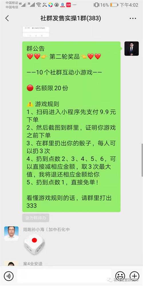 这个扔骰子的社群互动小游戏,比较适合促销活动,促进客户下单,以扔骰子的互动方式进行促销,做得好的话,一个社群批量成交上百单没问题。