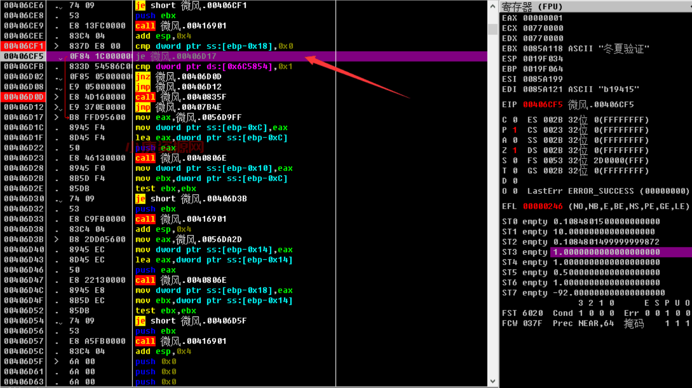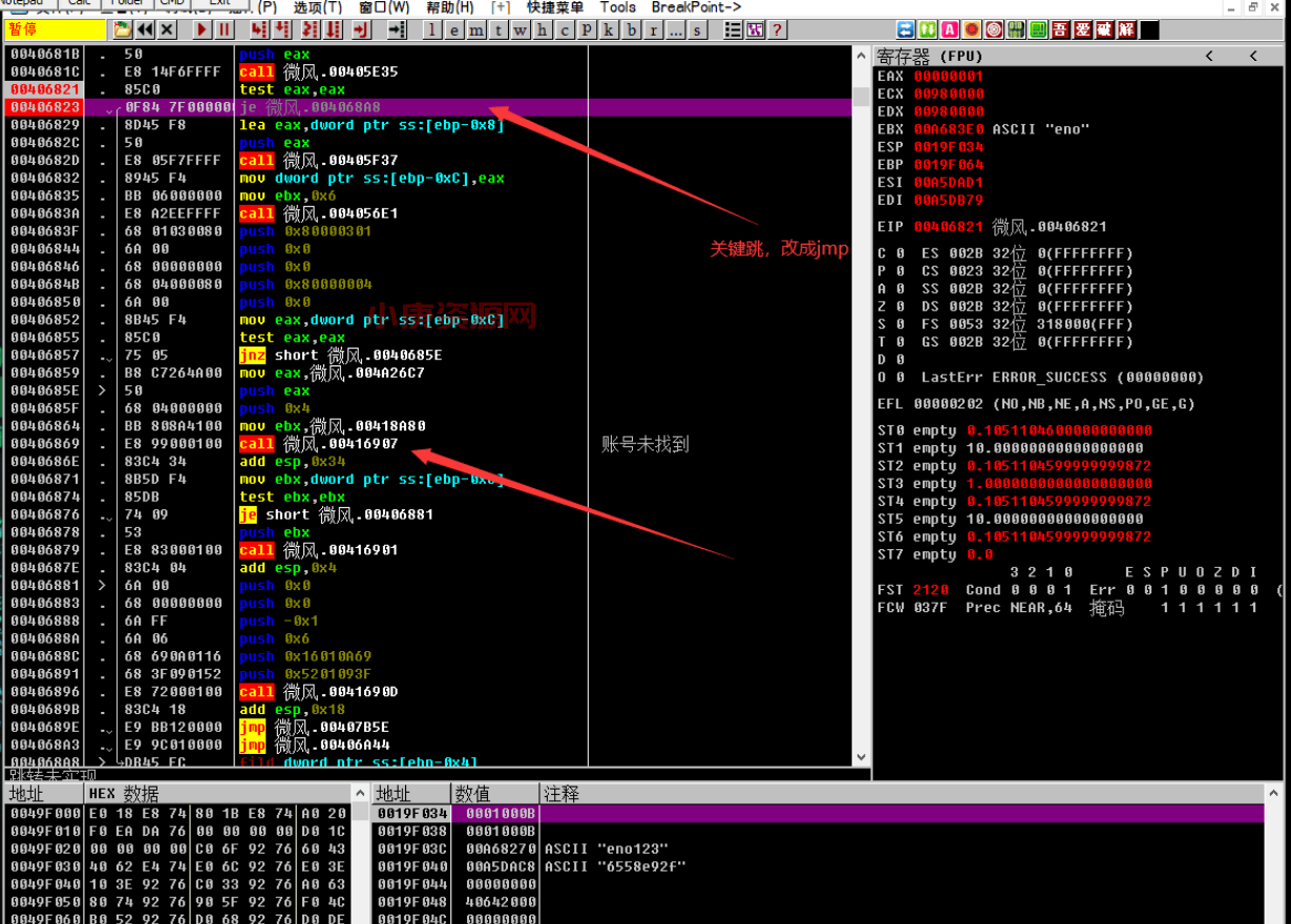 把条件跳转je改为无条件跳转jmp,继续单步跟