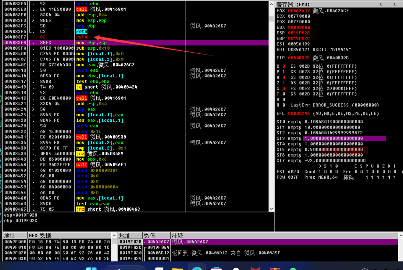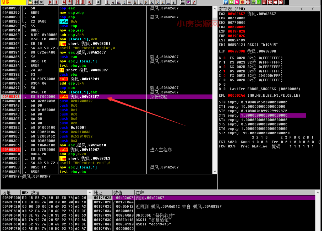 走到这个call这里会有一个用户身份识别的一个子程序,识别不通过程序就会终止,回车进去这个call,在它的段首直接retn