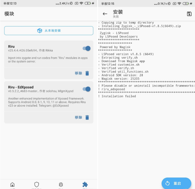 2-我们安装Shamiko和LSPosed-在面具首页最右边模块设置哪里-选择从本地安装-要把ed禁用了,要不然会出现安装lsp失败的情况,如下图显示