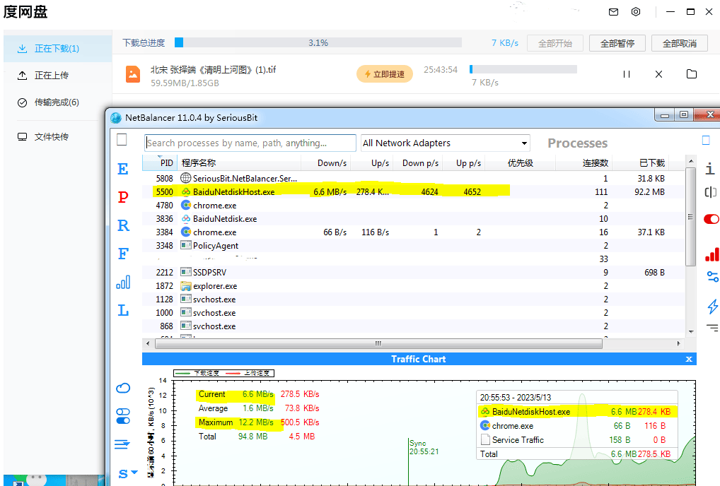可见下载速度明显增快。注意,百度网盘内部显示的下载速度是不对的,看进度条就行了。