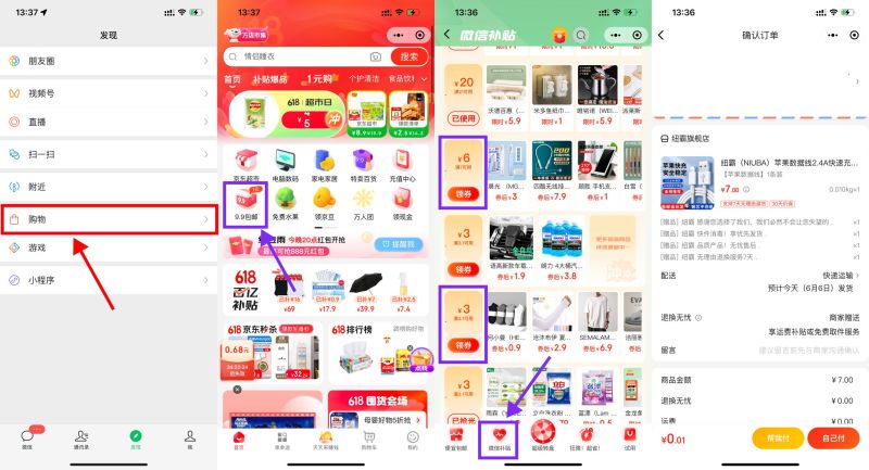 点击“微信-发现-购物”进入->点“9.9包邮”进入后点底部“微信补贴”->下拉有几个满减券,领取后点“去使用”筛选一下价格,挺多1元包邮的实物