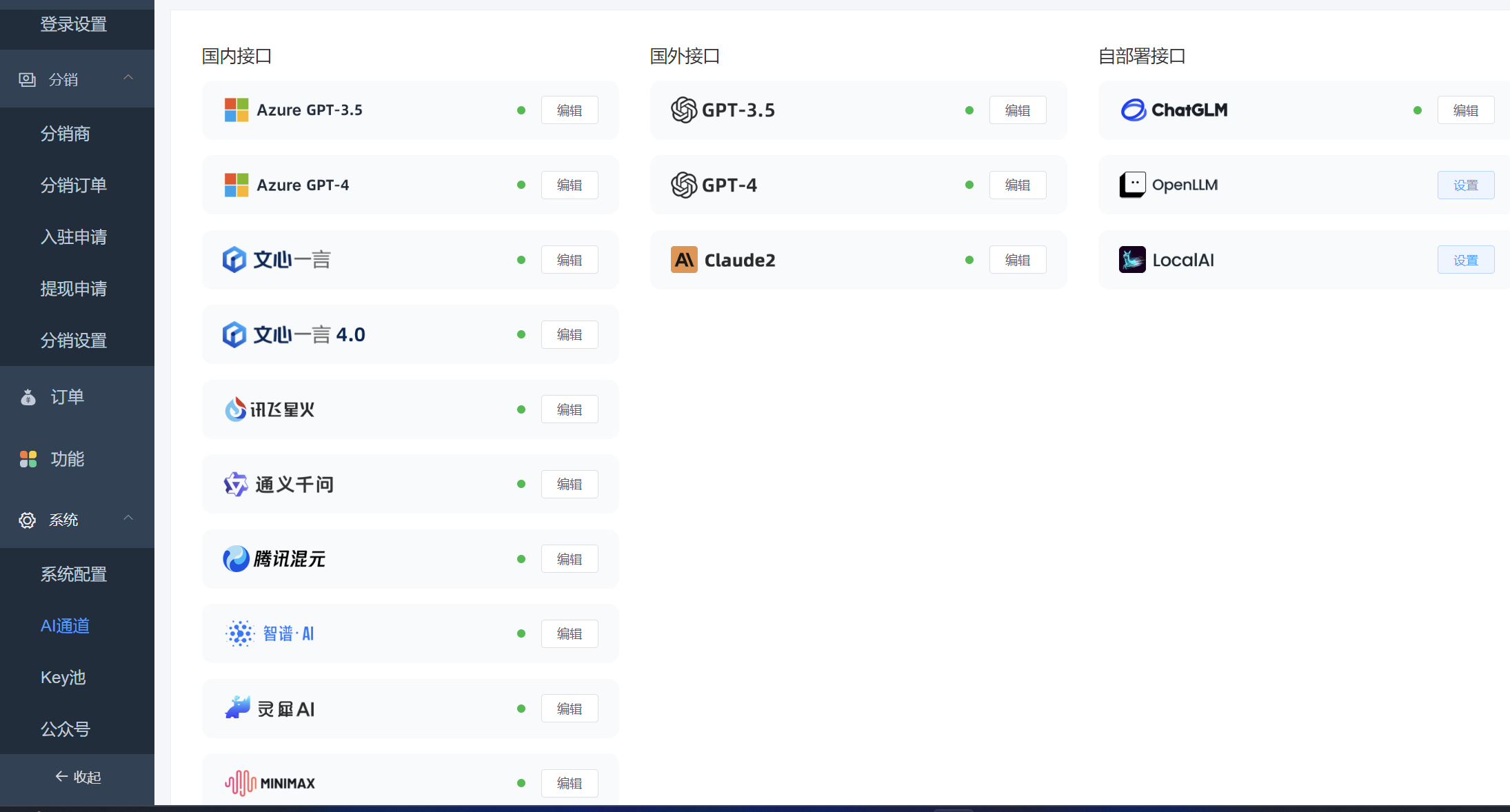 1、已对接国内百度文心、讯飞星火、Azure GPT、通义千问、腾讯混元、智普AI、Claude2等主流AI系统,还可以自建模型对接,目前是功能最全的一款AI。
