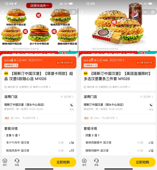 美团6.9元买塔斯汀汉堡套餐