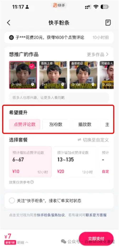 白杨再简单说一下,比如搜索点击,评论互动,点赞,分享这些都是可以来操作的,一种是用技术,一种是直接投放快手粉条也可以做这些数据,如图。
