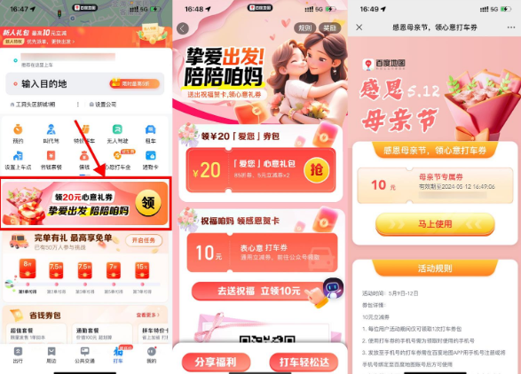 百度领取10亓和2张5亓打车券