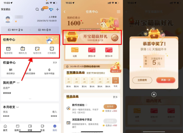建行每月开宝箱抽取各类卡券