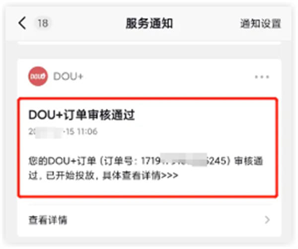 第四步:投放设置成功以后,只需要等待审核通过,你都Dou+订单就正式开始进入投放的阶段了;