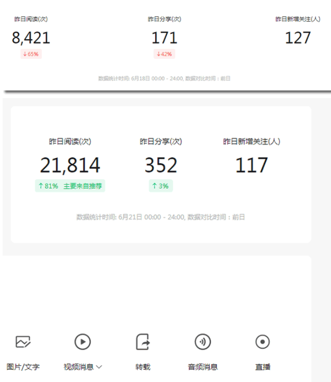 另外,这是我自己的公众号的数据(非本帐号),自从公众号改成抖音算法后,给了像我们小帐号一定机会。比如最近我的公众号文章,每天都是1-2万阅读量,新增的粉丝也不少。