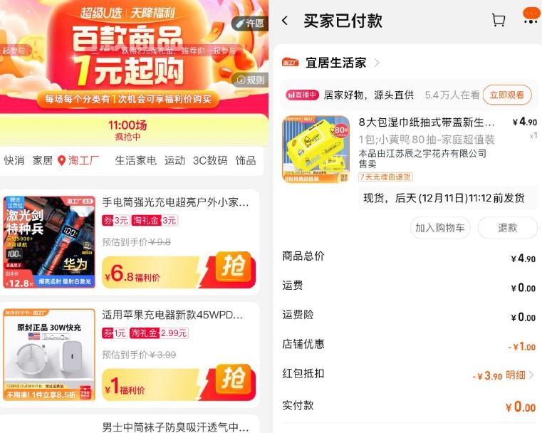 淘宝天降福利1元撸实物包邮