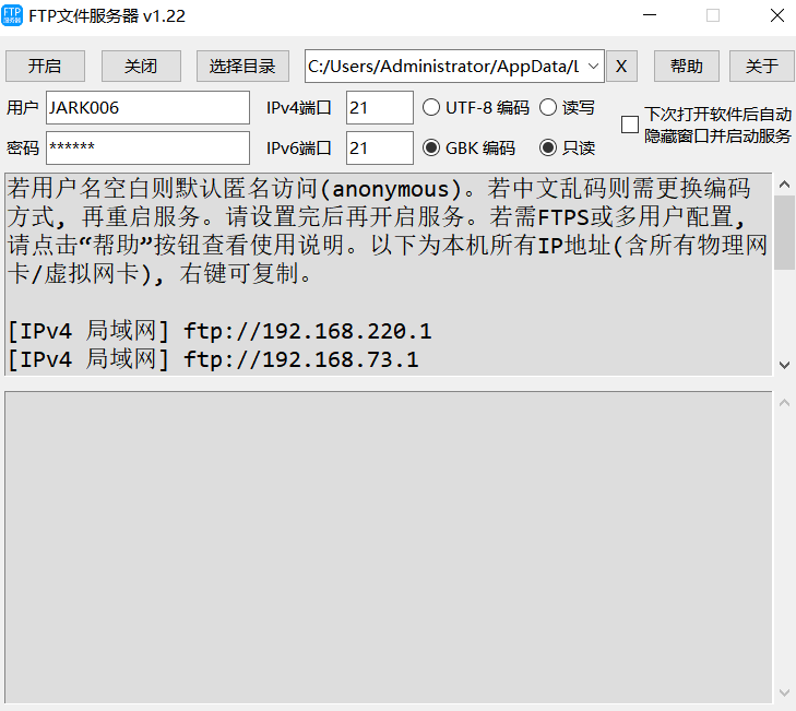 一键开启FTP文件服务器,方便其他设备通过网络传输、管理文件,支持IPV4,IPV6。