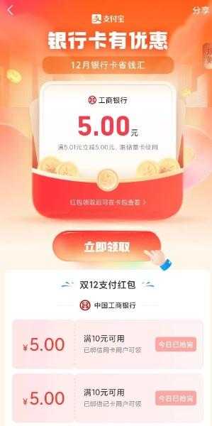 支付宝银行卡双12领5-10元银行红包,部分用户直接领满5.01-5元工行红包、或满10.01-10元中国银行红包,下拉还可以领其他银行的红包