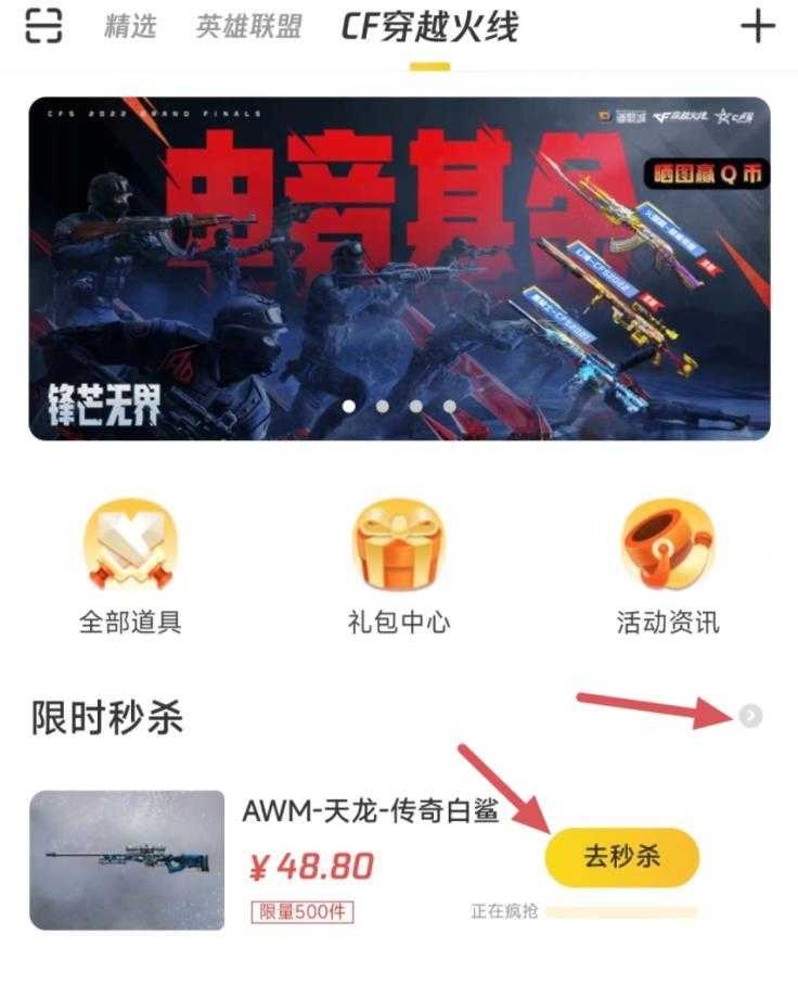 打开掌上道聚城APP--CF穿越火线--点击【去秒杀】可秒杀当前道具;点击右侧箭头则进入当前所有秒杀道具页面