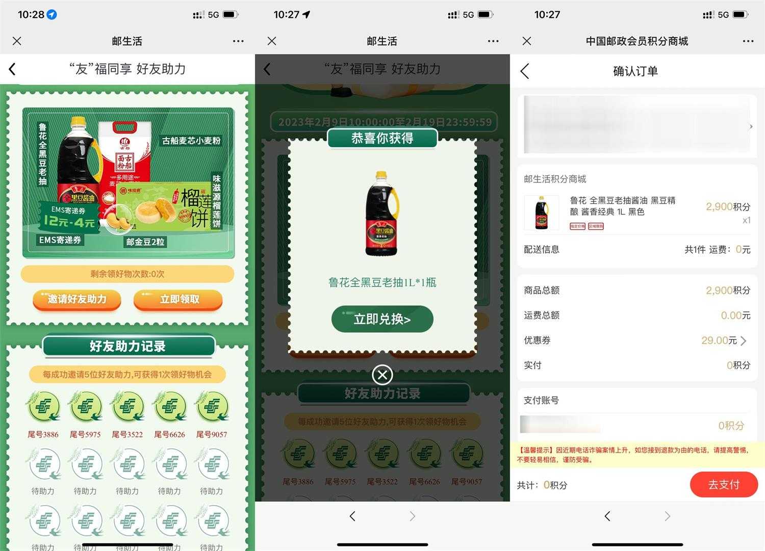 邮生活好友助力0元撸3个实物