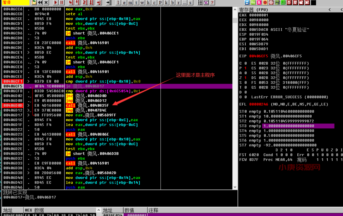 运行到这里看到一个je跳转实现了,直接跳过了主程序,我们暂且先让他跳,继续单步跟,看看会发生什么
