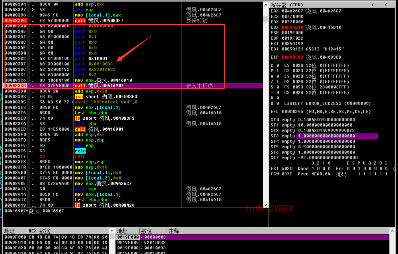 走到这个call这里会有一个用户身份识别的一个子程序,识别不通过程序就会终止,回车进去这个call,在它的段首直接retn