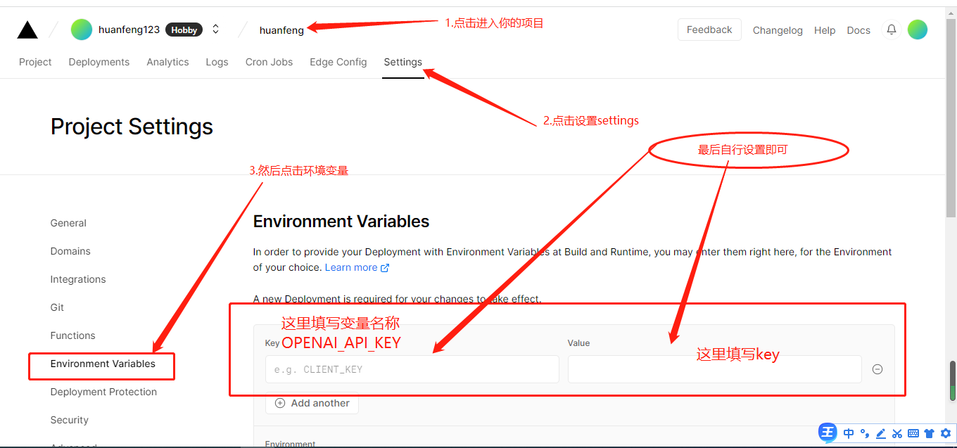 后续可以在vercel后台 设置-环境变量-添加变量:OPENAI_API_KEY= 填入OPENAI API KEY的值