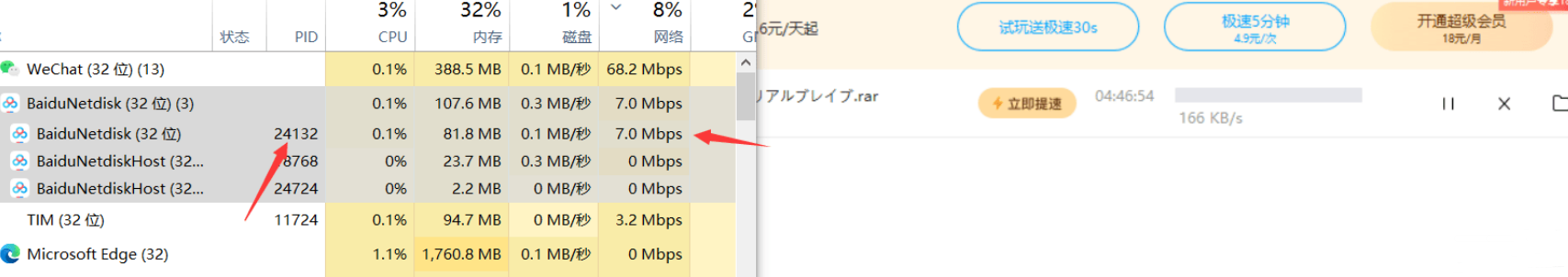 首先,百度云在下载的时候会打开几个服务,但只有一个是用于下载的。我们可以通过任务管理器的网络使用情况来判断是哪个进程在下载,然后记住它的pid号,在ce中选择对应的一个。