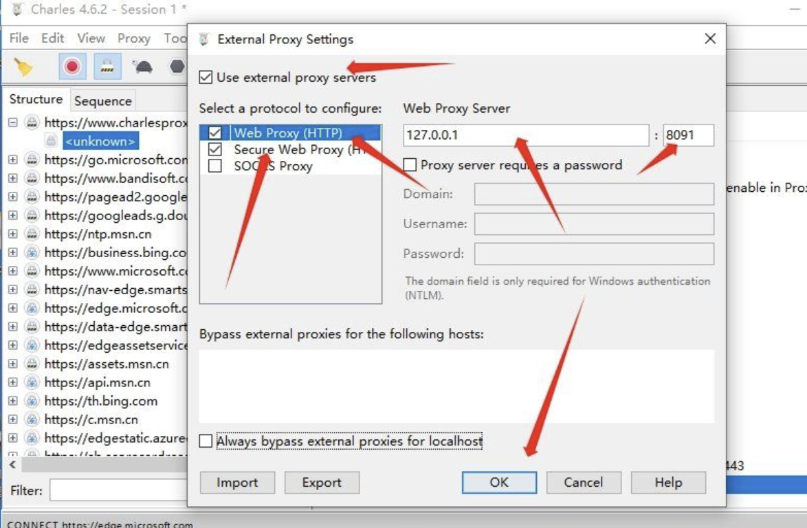注意,Web Proxy(HTTP)和Secure Web Peoxy(HTTPS)都需要填写127.0.0.1以及端口(这里填的都是8091),这和后续配置BurpSuite代{过}{滤}理的端口一致。
