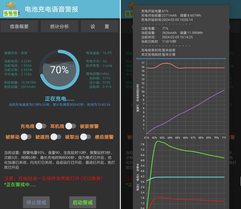 可以自定义报警电量值、提示音大小、更改提示音乐