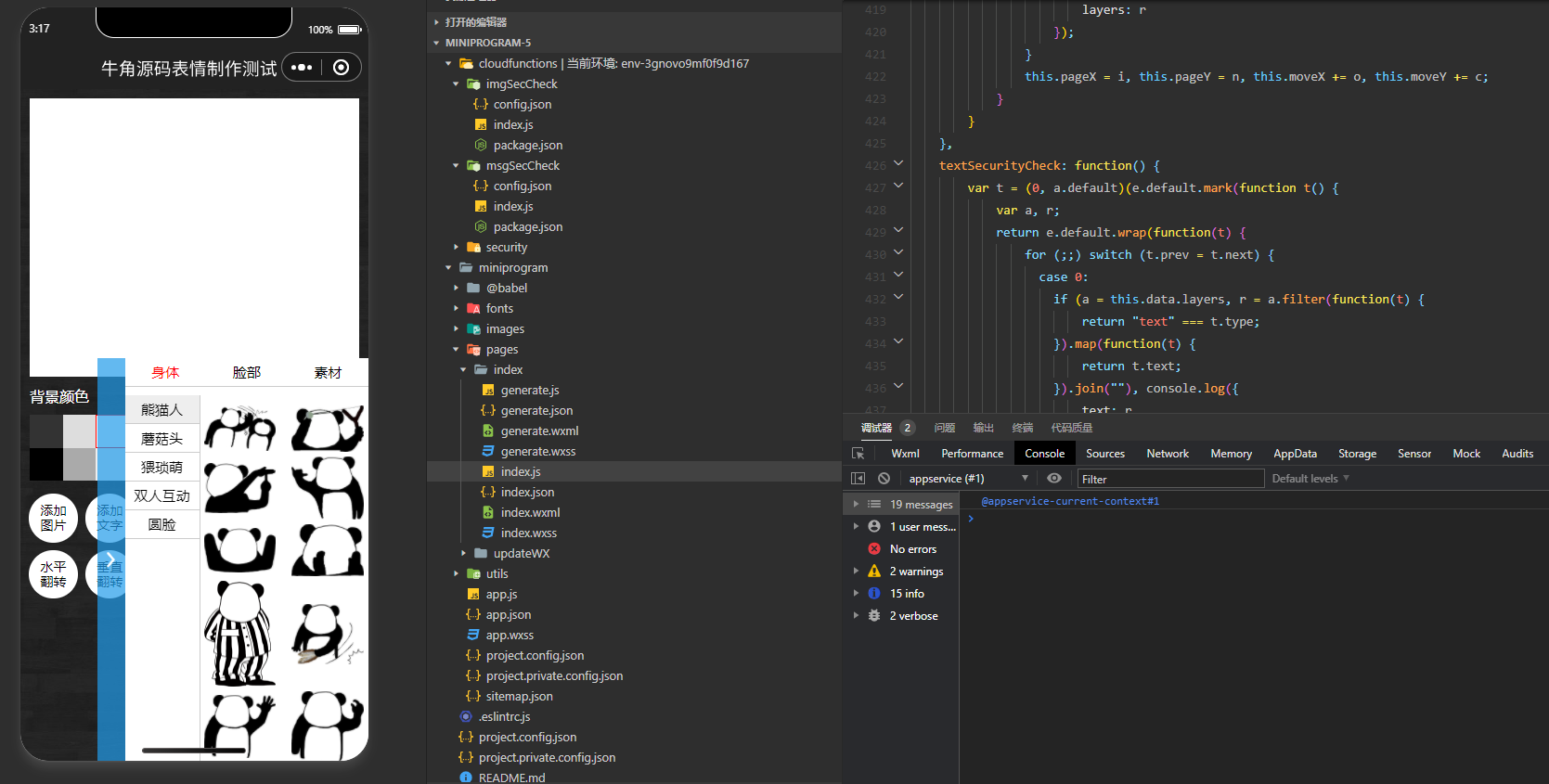 这个表情包制作小程序,功能很自由,于是我想上线一个,本来一切都很顺利,在开发者工具里运行“完美”,我就没想太多,随便测试一下,加了点推广就上传代码了,并把代码扔到了即刻取图群里。