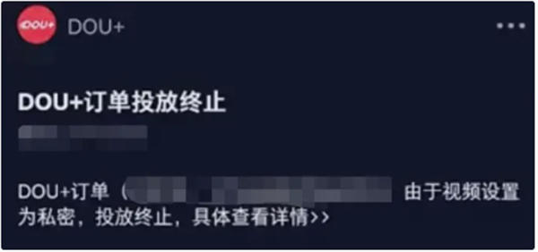 Step04:这个时候,你的后台就会收到一条系统通知,告知你该视频的Dou+被终止投放了。
