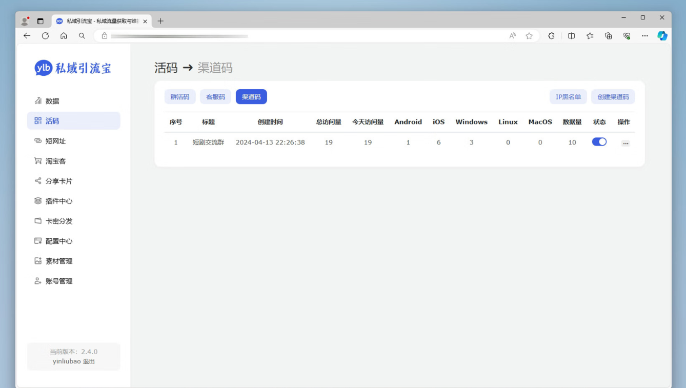 群活码、客服码、渠道码、短网址、淘宝客中问页、多项单页、分享卡片当天总访问量统计、各时段访问量统计,今天IP和昨日IP统计、近7天IP数据展示。
